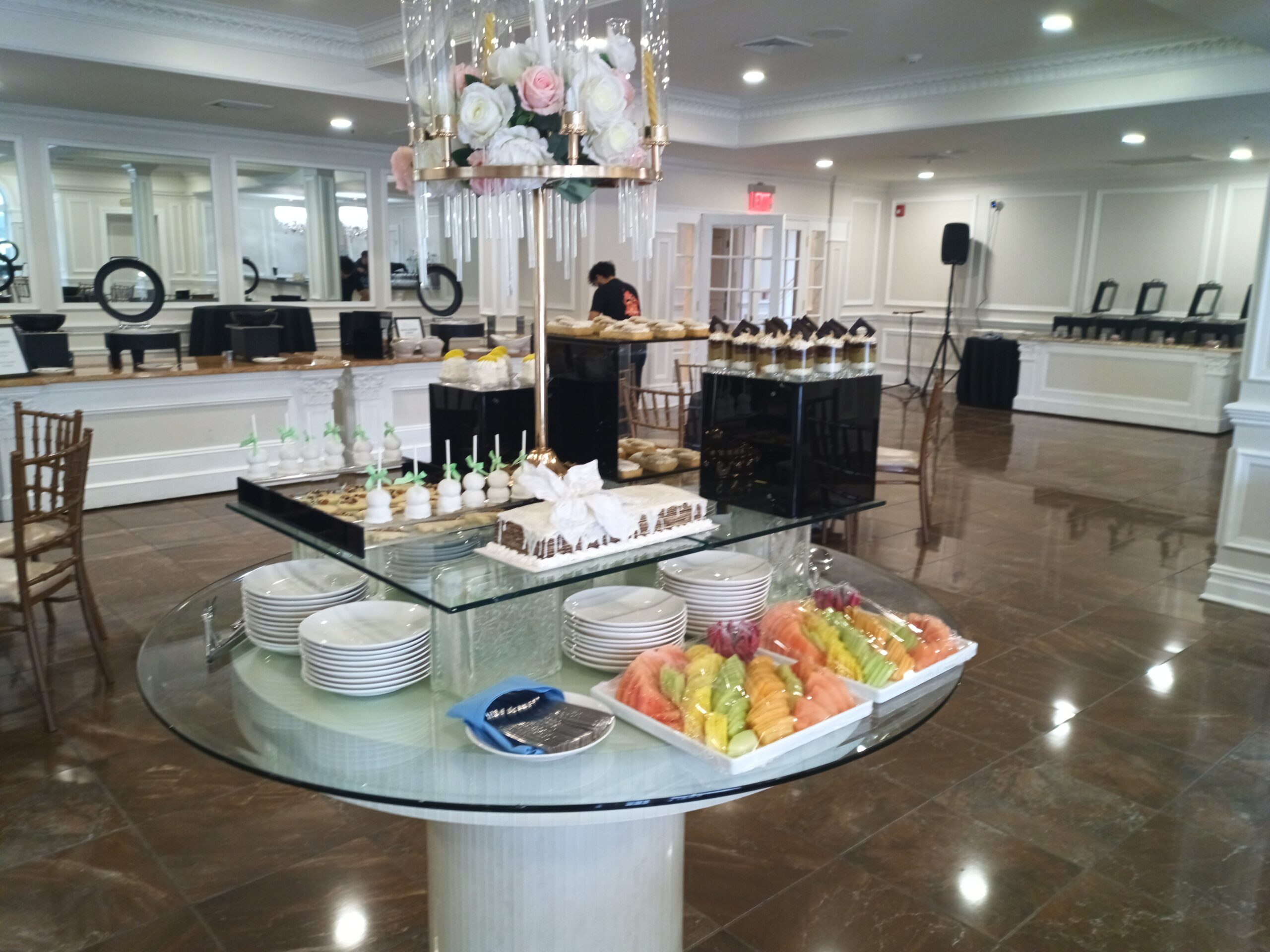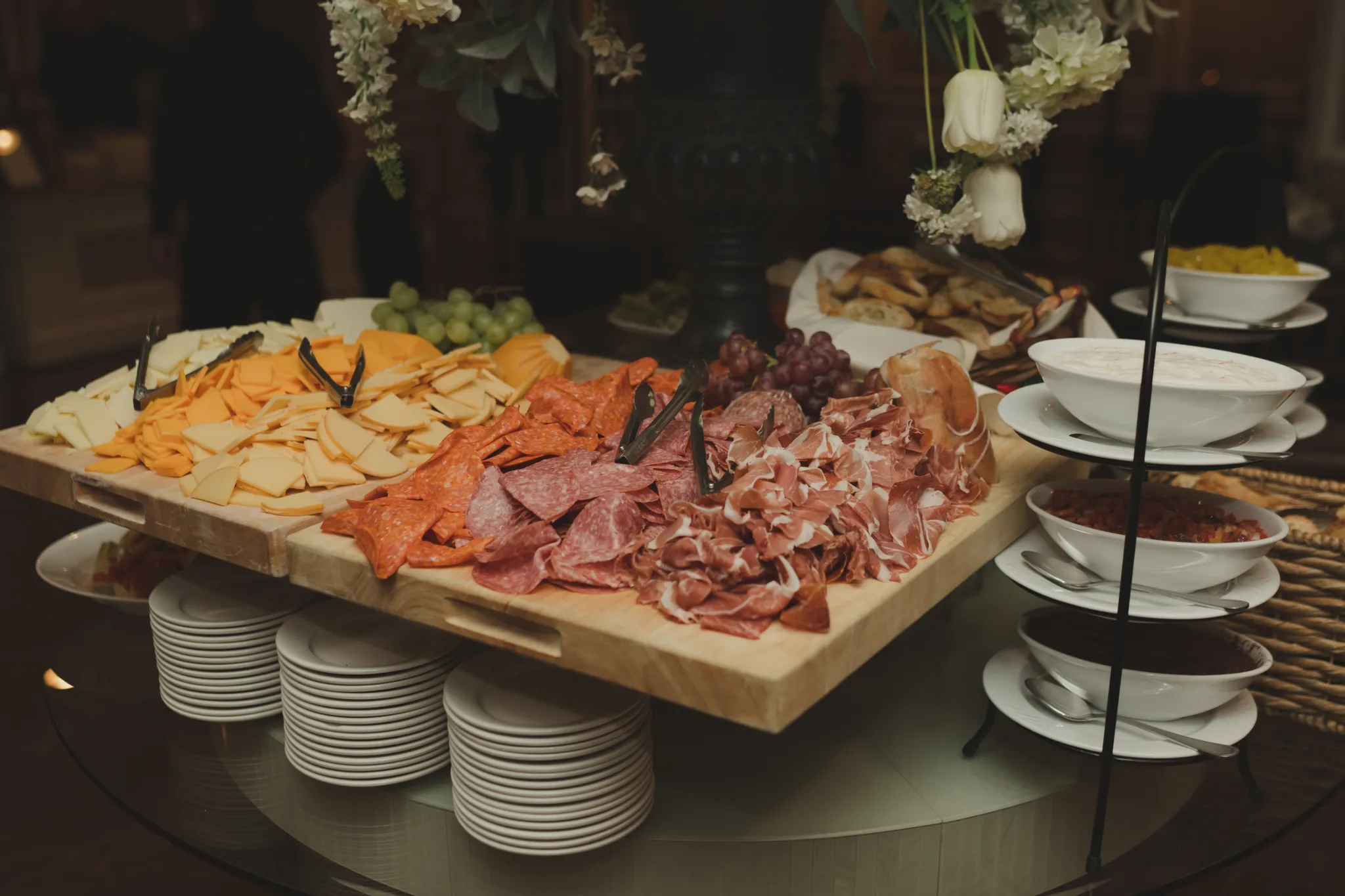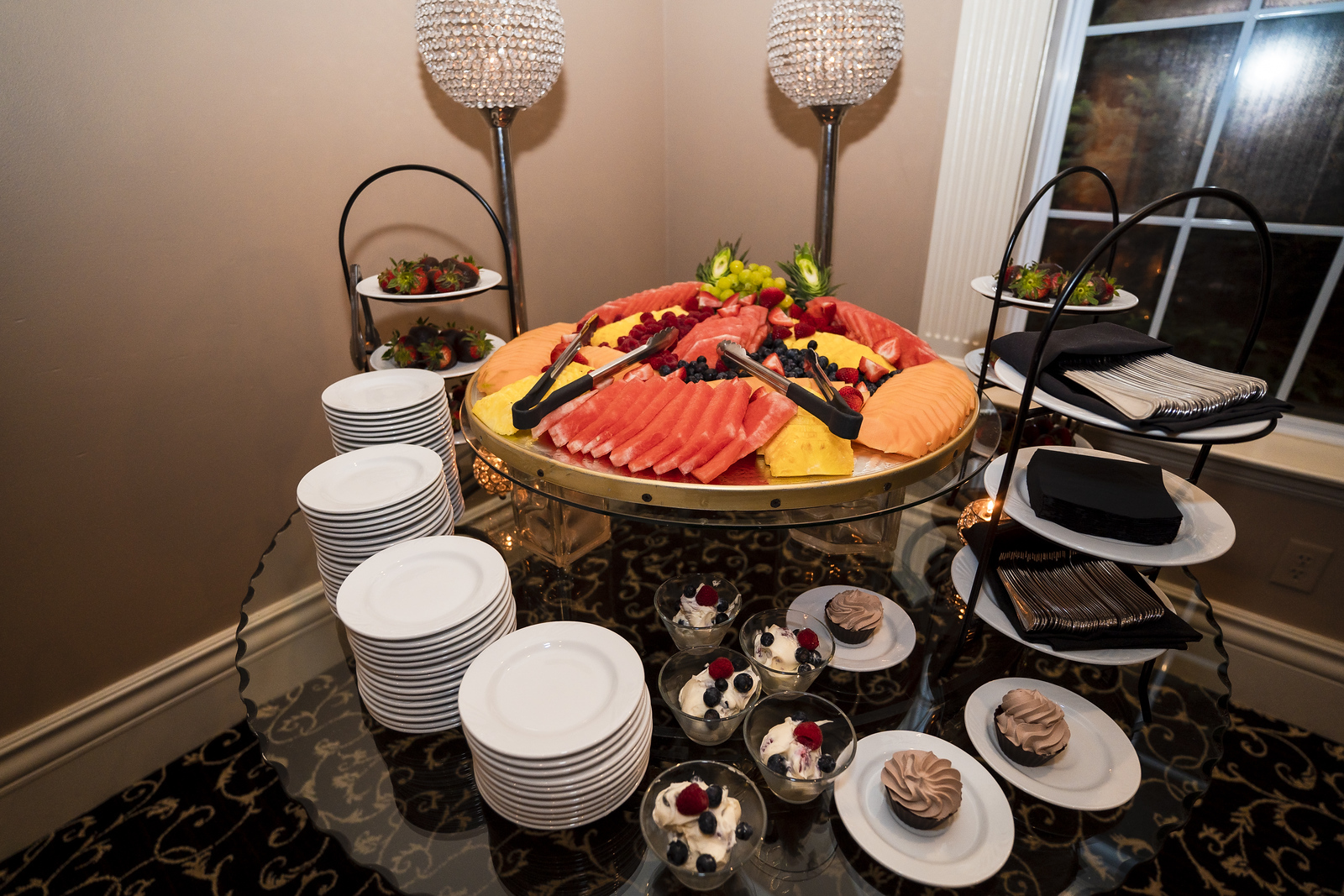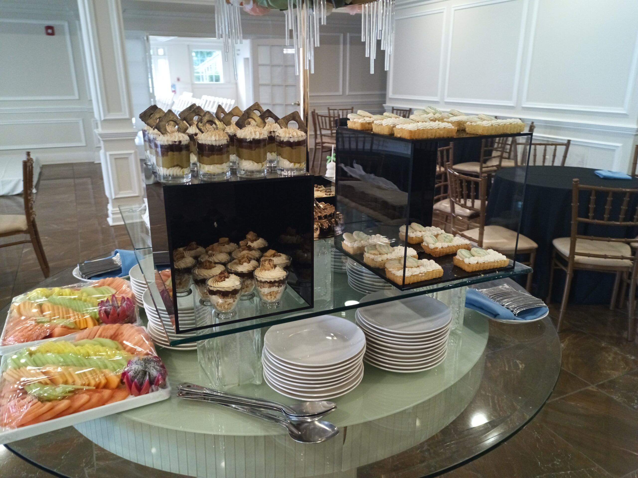 Elegant Dishware, Fresh Fruit Cups, Miniature Desserts, Assorted Salads, Side of Salmon, Passing Finger Food, Pulled Beef Tacos, Deli Roll, Chocolates, Alcoholic Beverages.