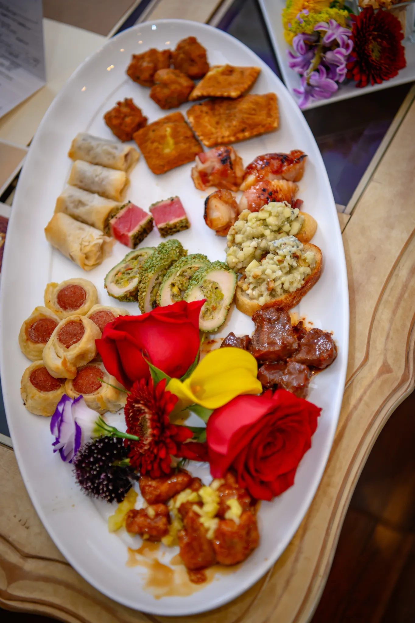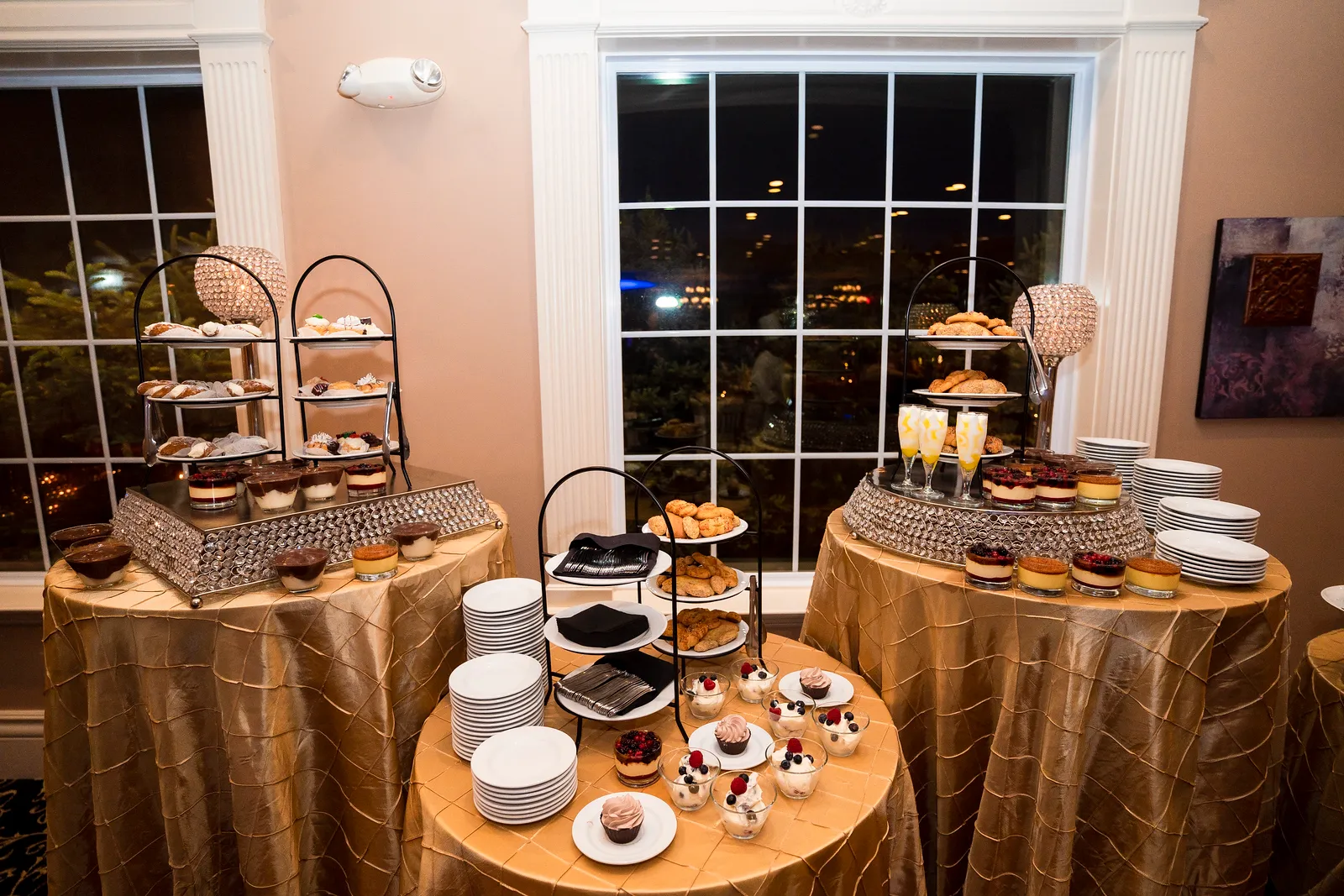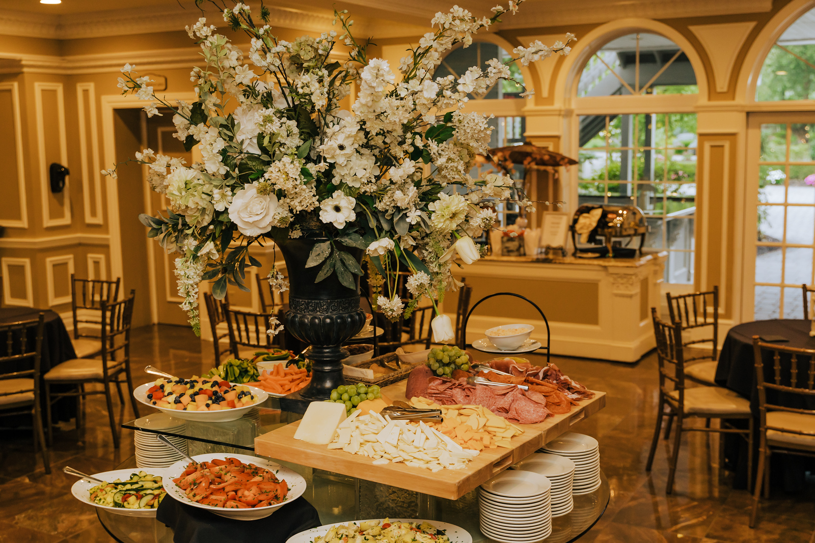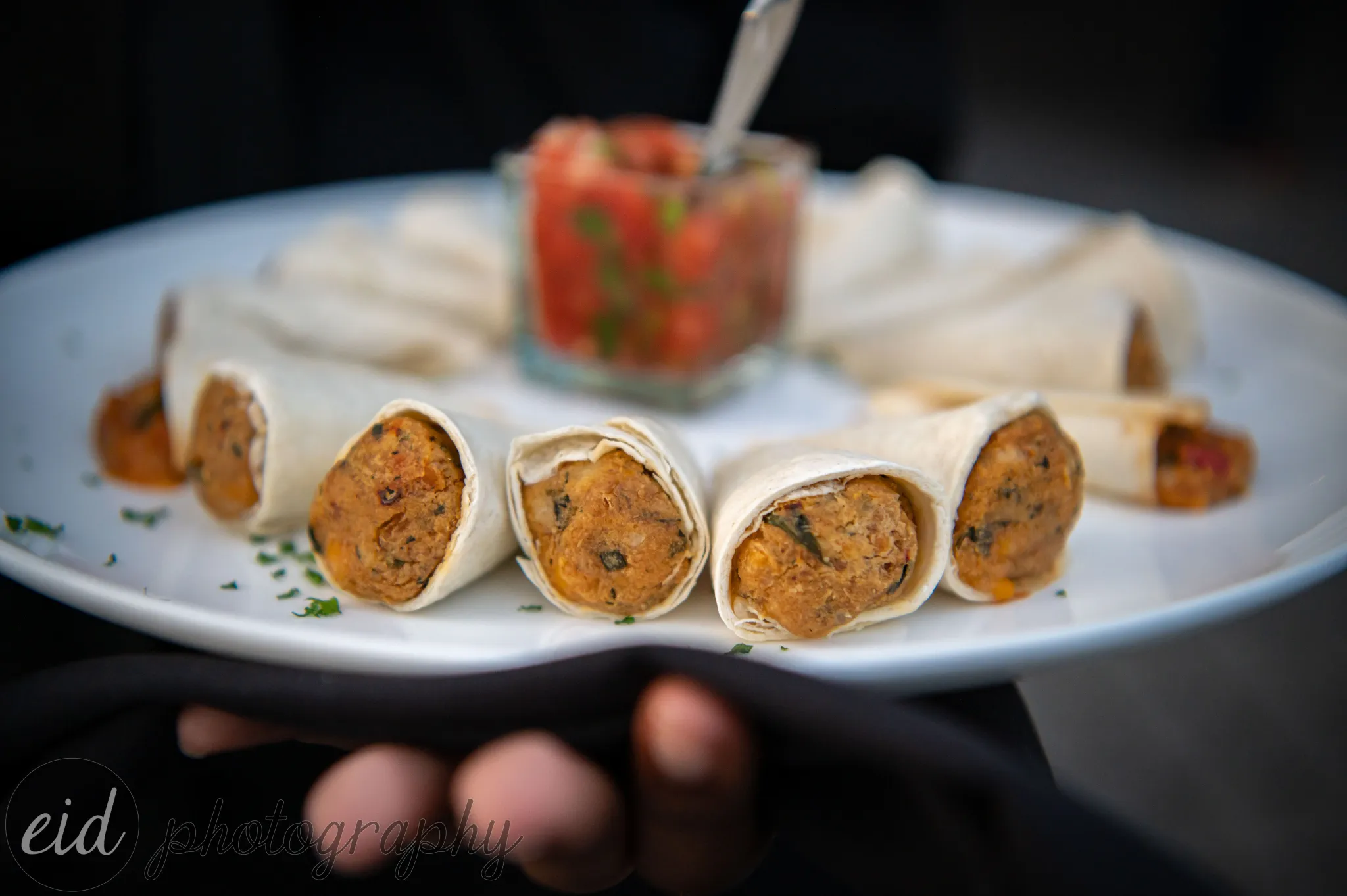 Elegant Dishware, Fresh Fruit Cups, Miniature Desserts, Assorted Salads, Side of Salmon, Passing Finger Food, Pulled Beef Tacos, Deli Roll, Chocolates, Alcoholic Beverages.