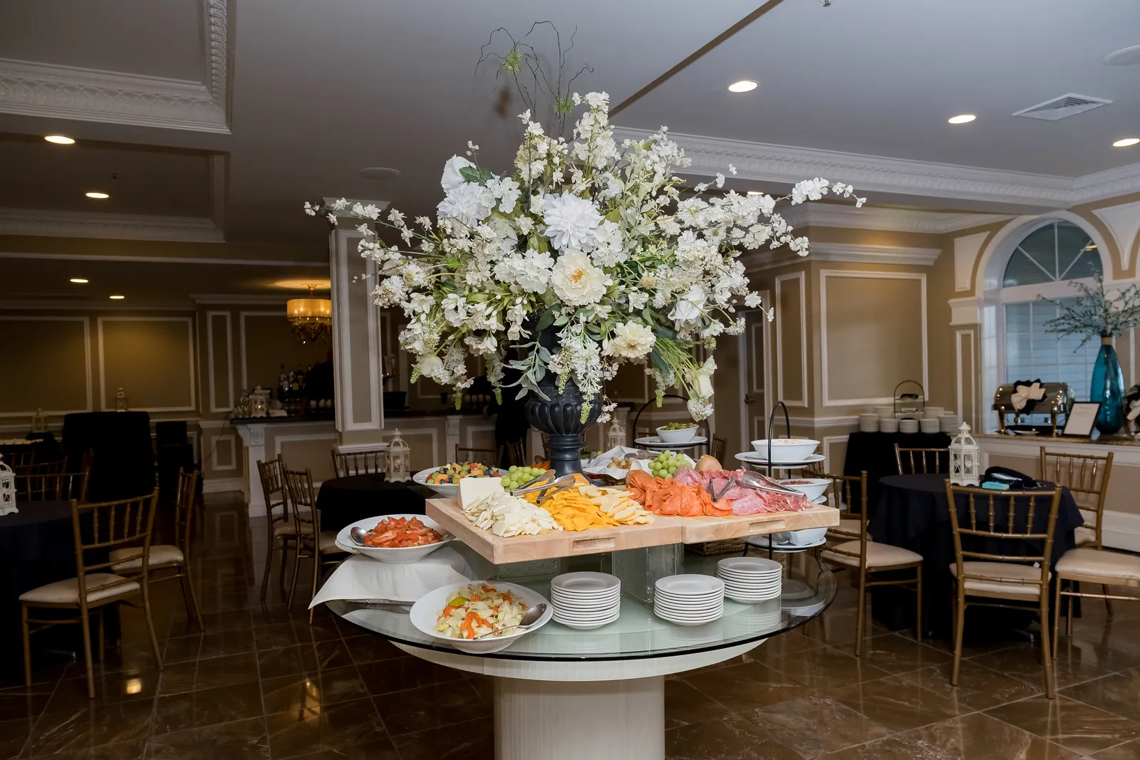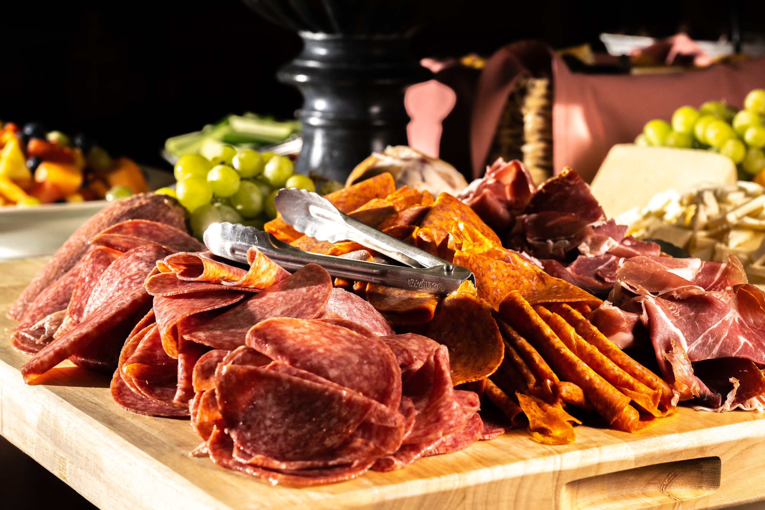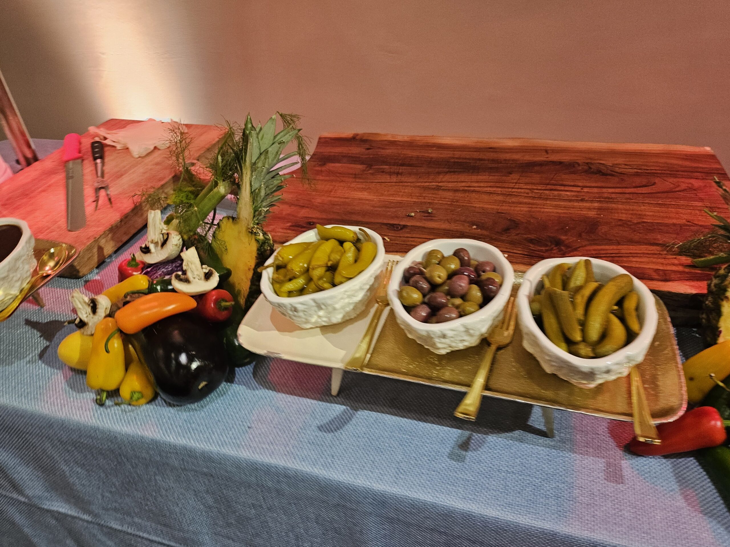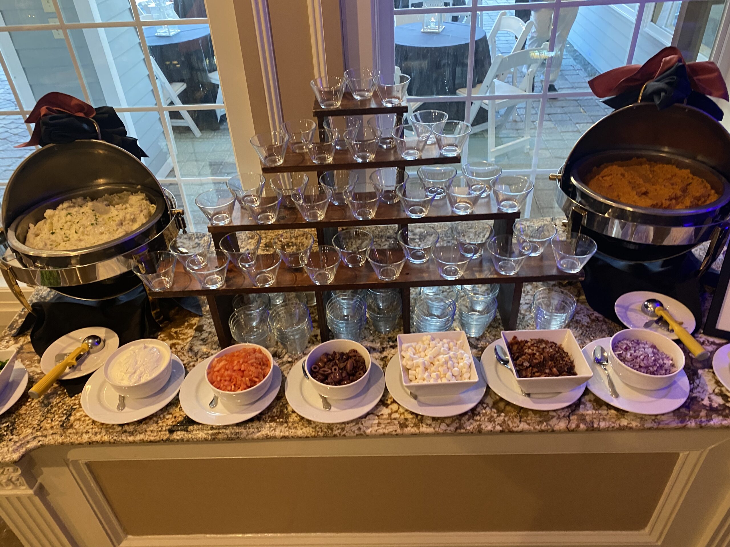 Elegant Dishware, Fresh Fruit Cups, Miniature Desserts, Assorted Salads, Side of Salmon, Passing Finger Food, Pulled Beef Tacos, Deli Roll, Chocolates, Alcoholic Beverages.