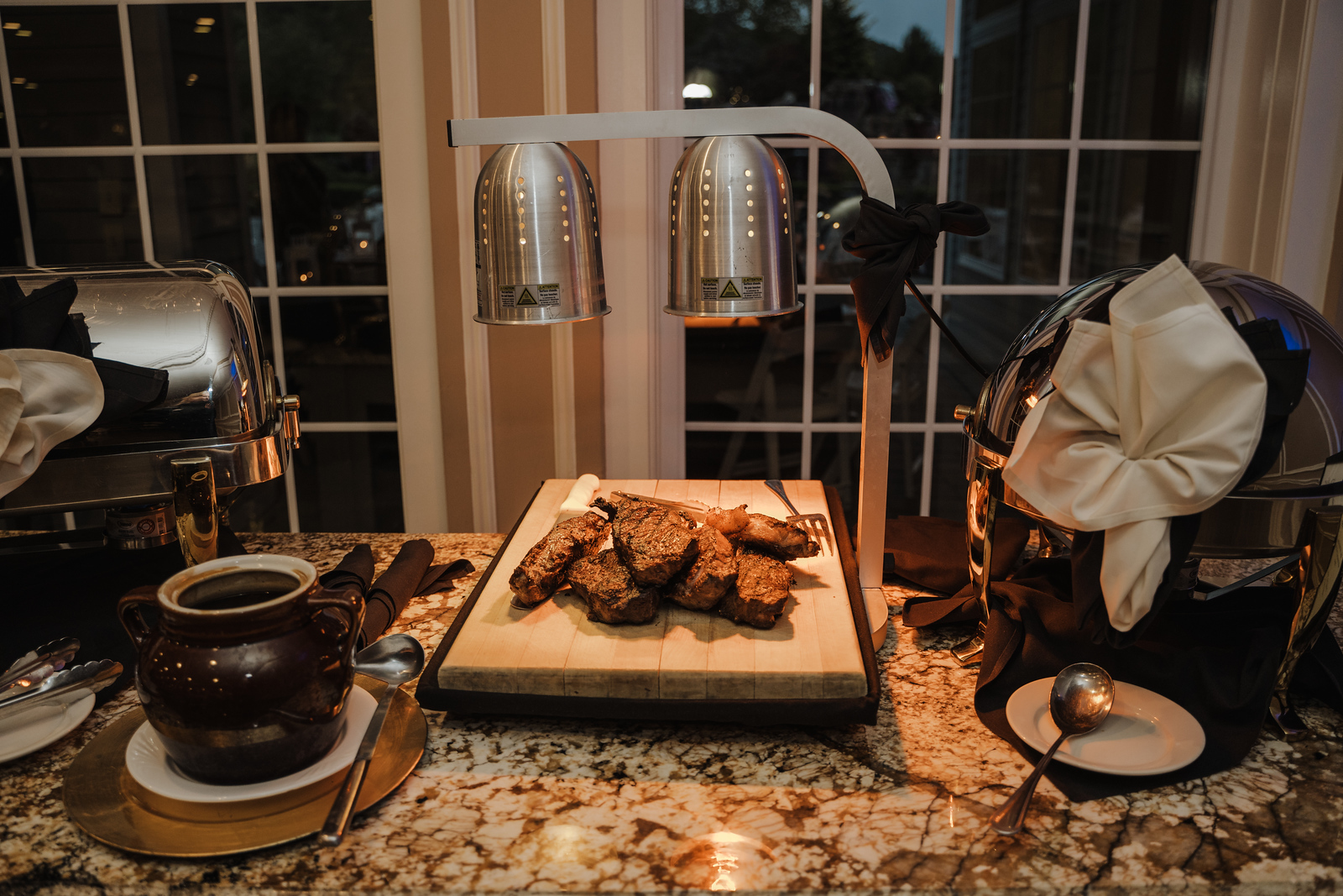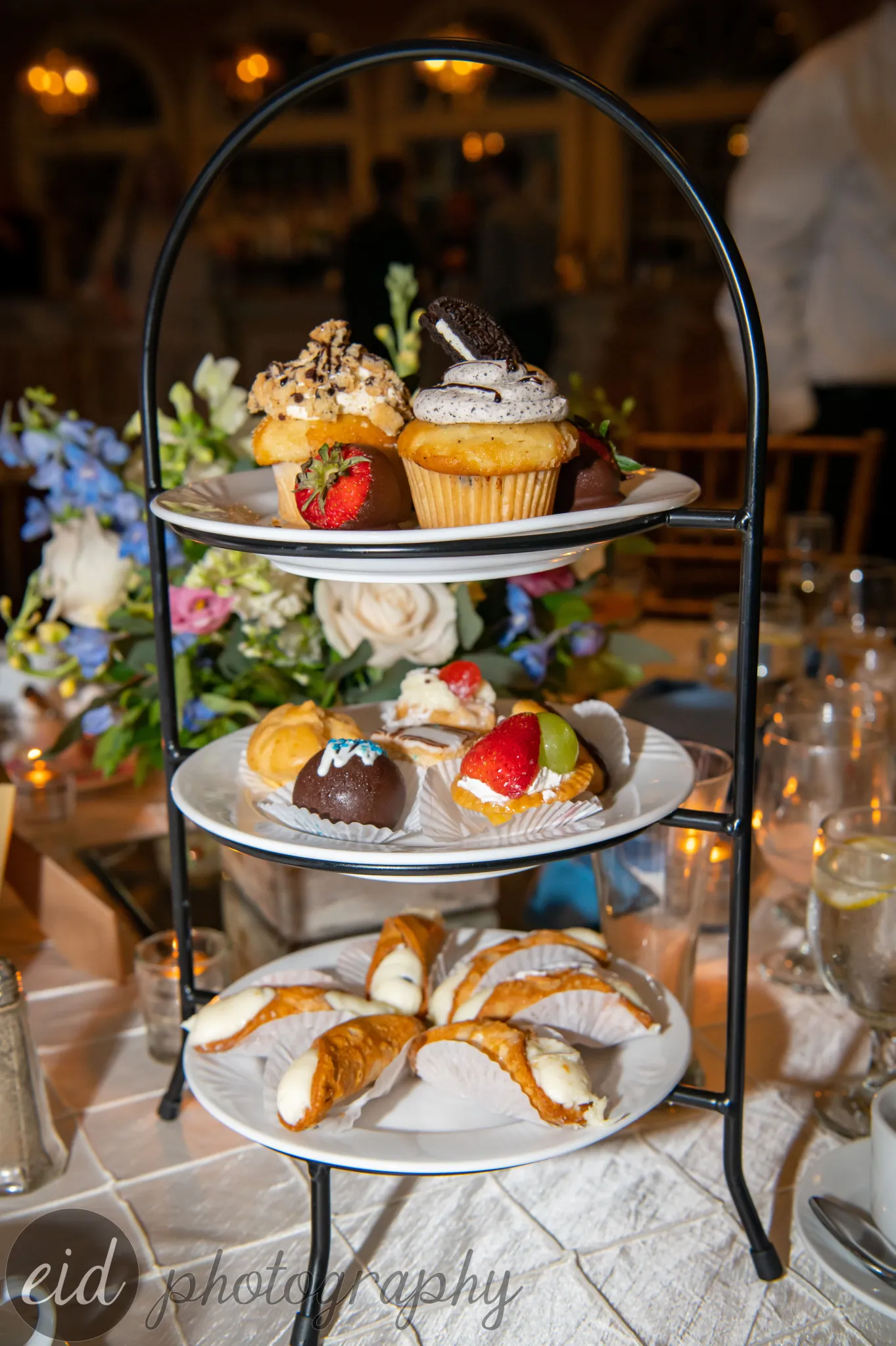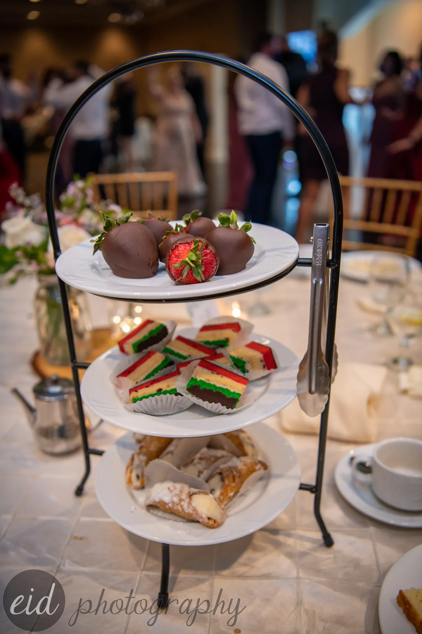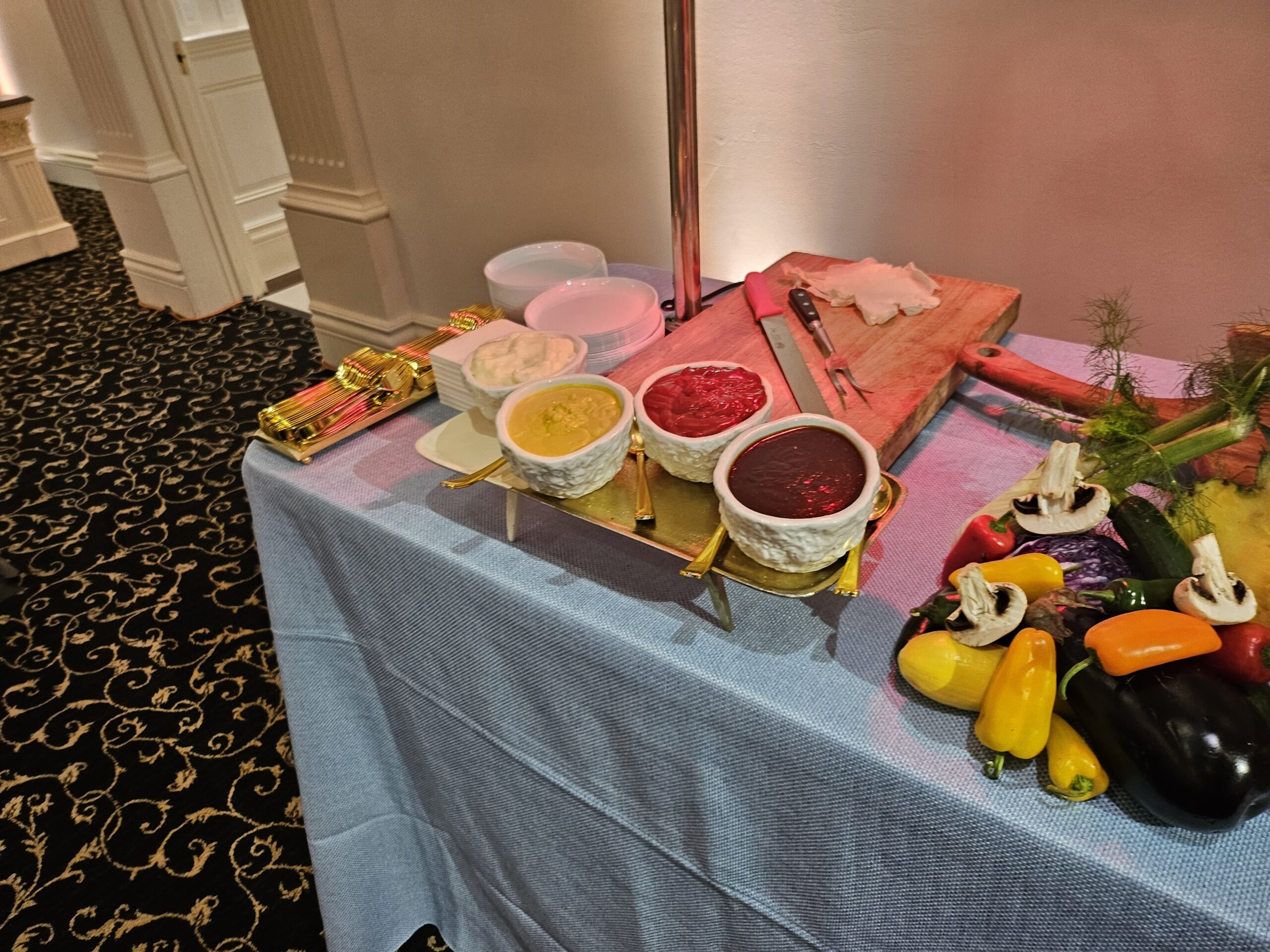 Elegant Dishware, Fresh Fruit Cups, Miniature Desserts, Assorted Salads, Side of Salmon, Passing Finger Food, Pulled Beef Tacos, Deli Roll, Chocolates, Alcoholic Beverages.