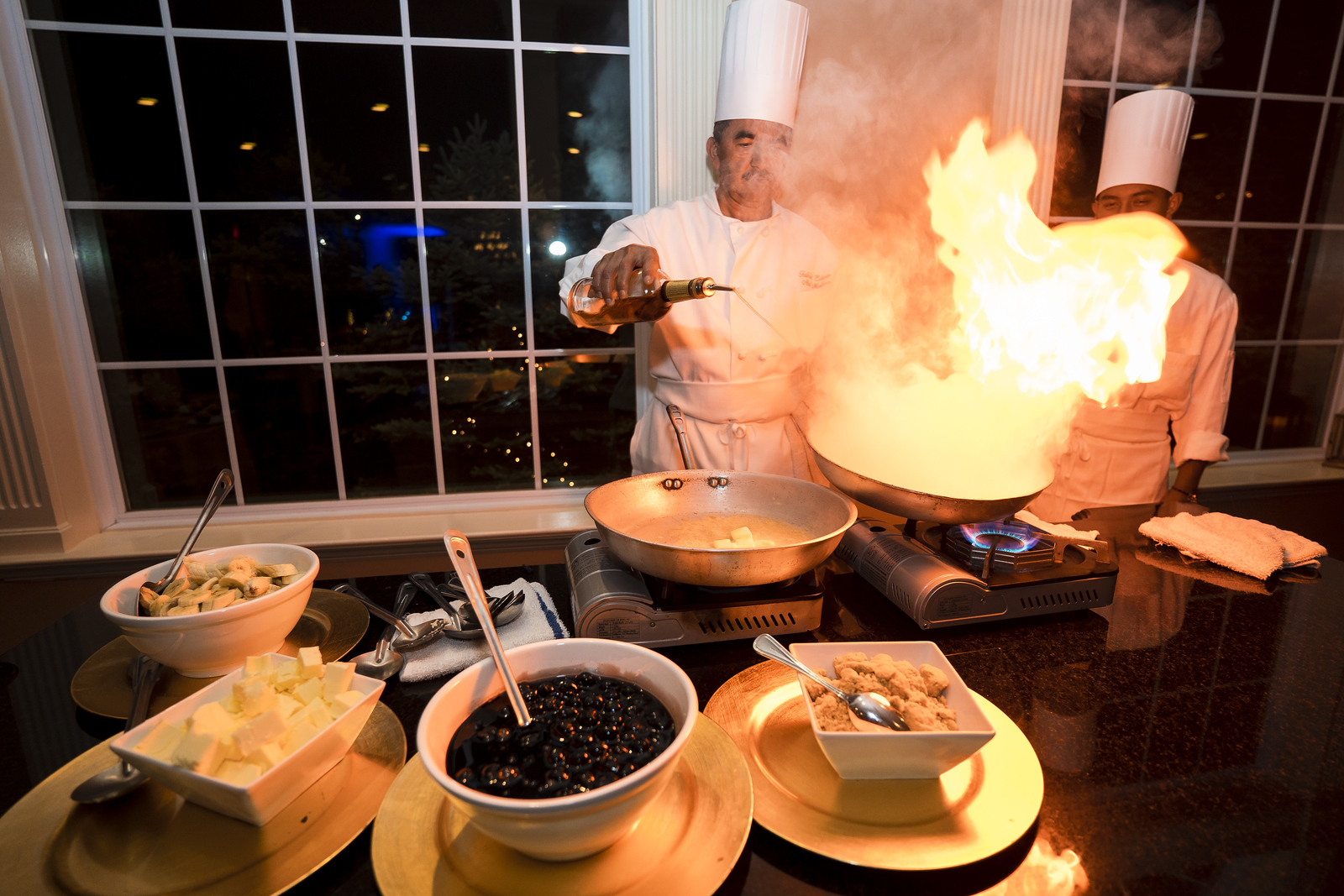 Ice cream & Ice logs, Warm Cinnamon Buns, Mini Donuts, Mini Cinnamon Sticks, Wafer Cake,Apple Cobbler, Fruits,Chocolate and Cookies, Cofee and Tea.