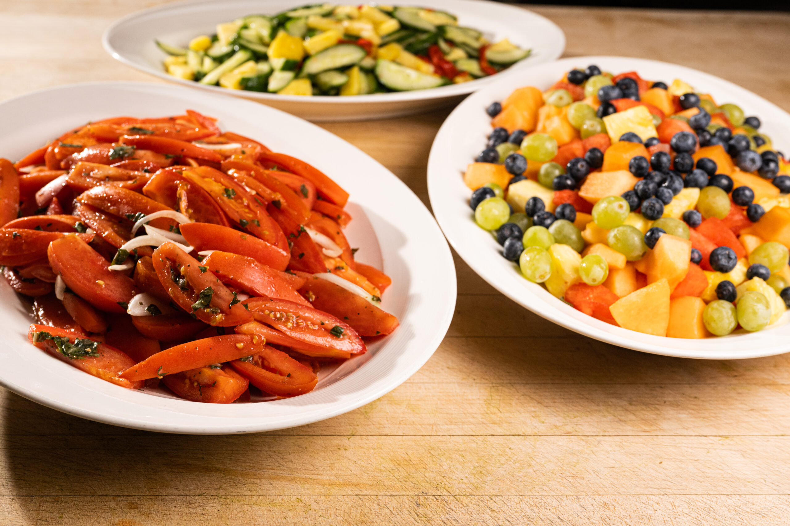 Mashed Potatoes with Fried Onions, 3 Ball Potatoes on Skewer, 3 Strips White & Sweet Potatoes, Smashed Potatoes, Spanish Rice, Stir Fry Vegetables, Long Stem Broccoli with Mini Pepper, Whole Bean Bundle, Diced Mini Grilled Vegetable (Sweet Potato, Portabella, Mushroom Peas)