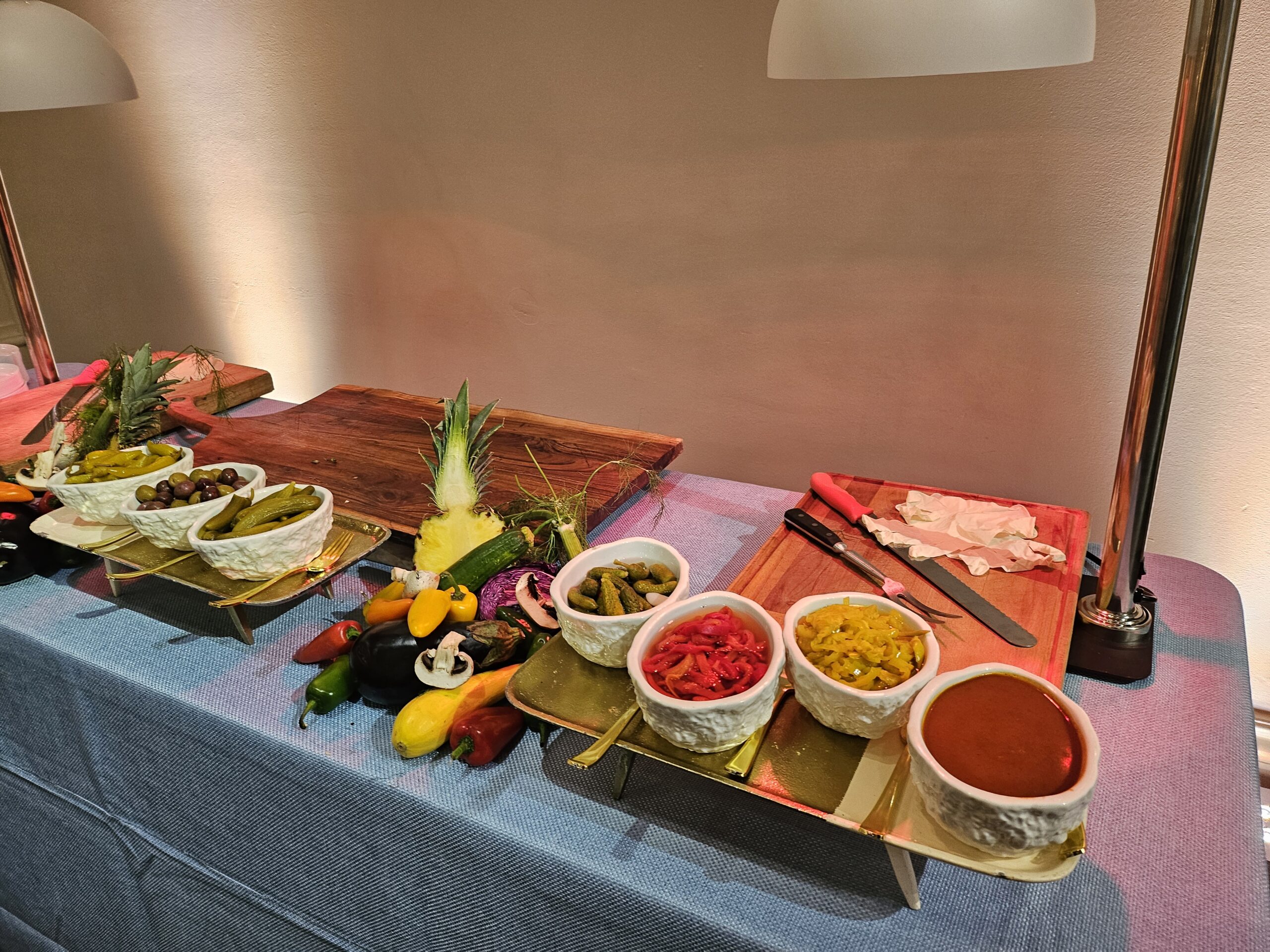 Brisket Eggroll on Sweet Potato Puree, Flower Salmon on Angle Hair, Decorated Turbo Fish Plate, Mock Liver Baguette Tower with Pastrami, Grilled Pastrami Salad, Gnocchi with Vegetable Cigar in a Pastrami Sauce, Quinoa with 2 Slices Pastrami, 2 Brisket Slice on Color Peas.